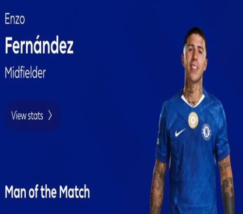 英超第20轮,切尔西客场1-1战平曼城,此役攻入绝平进球的切尔西中场恩佐当选全场最佳球员。