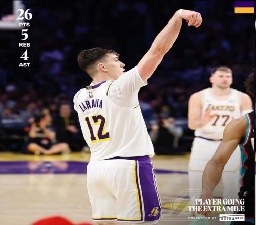詹姆斯在谈到拉拉维亚出色的表现时表示:“很显然,在缺少AR(里夫斯)、八村塁和文森特的情况下,我们需要有人能时不时地爆发式得分,杰克(拉拉维亚)的挺身而出对我们至关重要,他现在打出了极强的自信。”